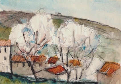"Le hameau fleuri" 1934 - Dessin aquarellé (9x12,8cm) "The hamlet in blossom" 1934 - Watercolor drawing (9x12,8cm) |